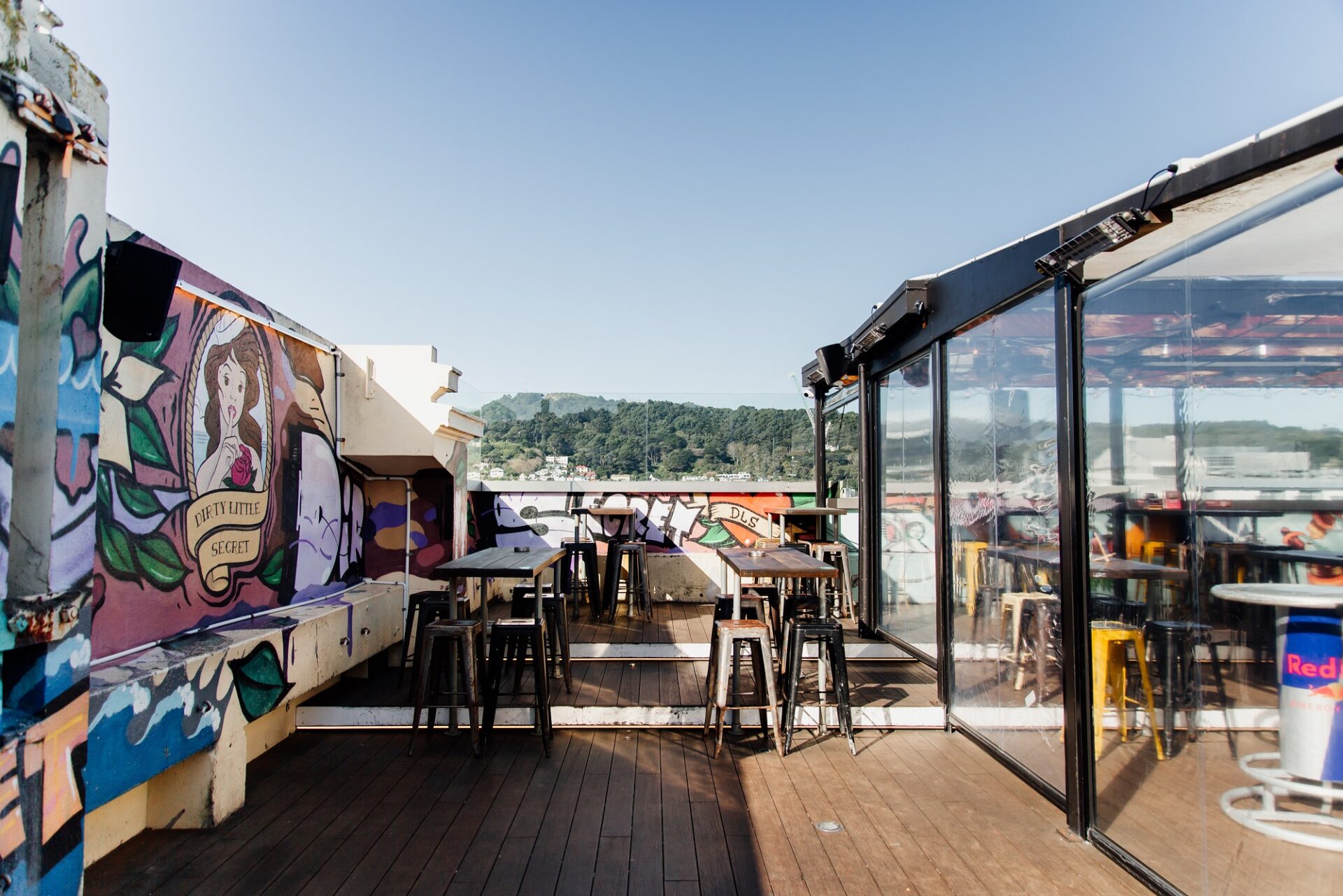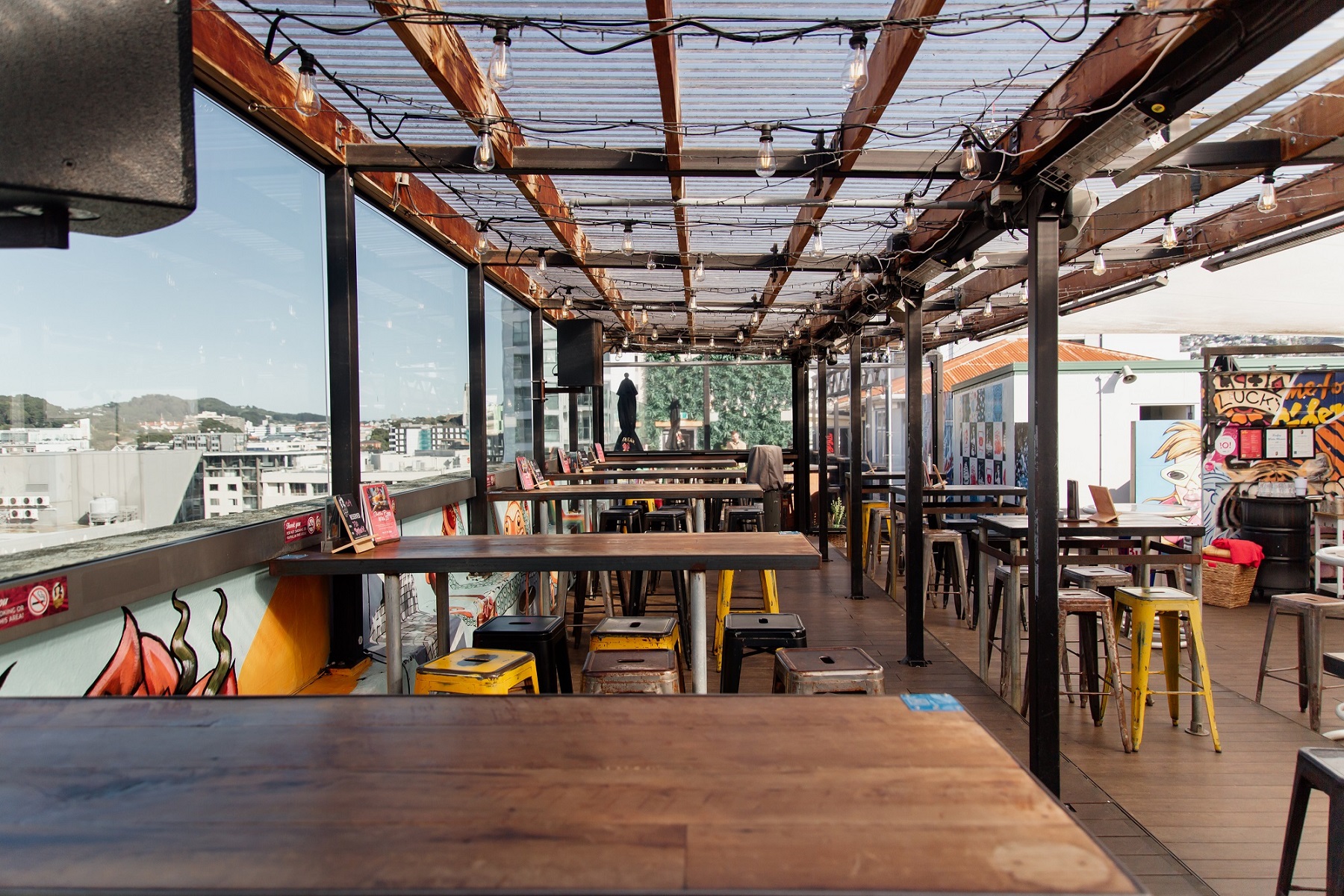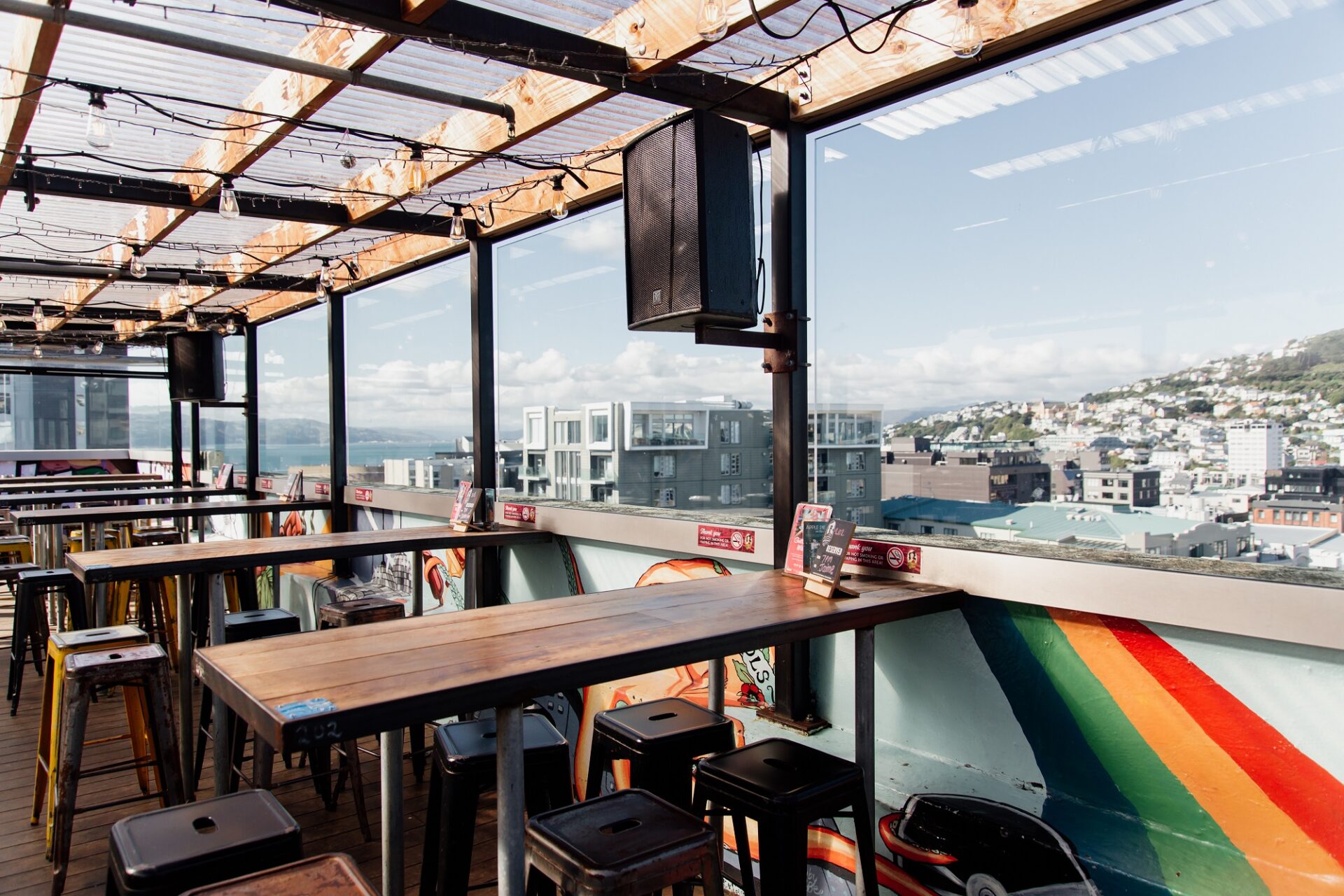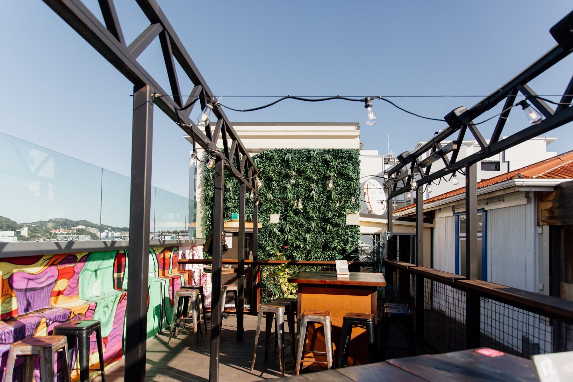 Semi-private outdoor space with views for days over the water and Courtenay Place, with Insta – worthy wall art and in close proximity to the bar.