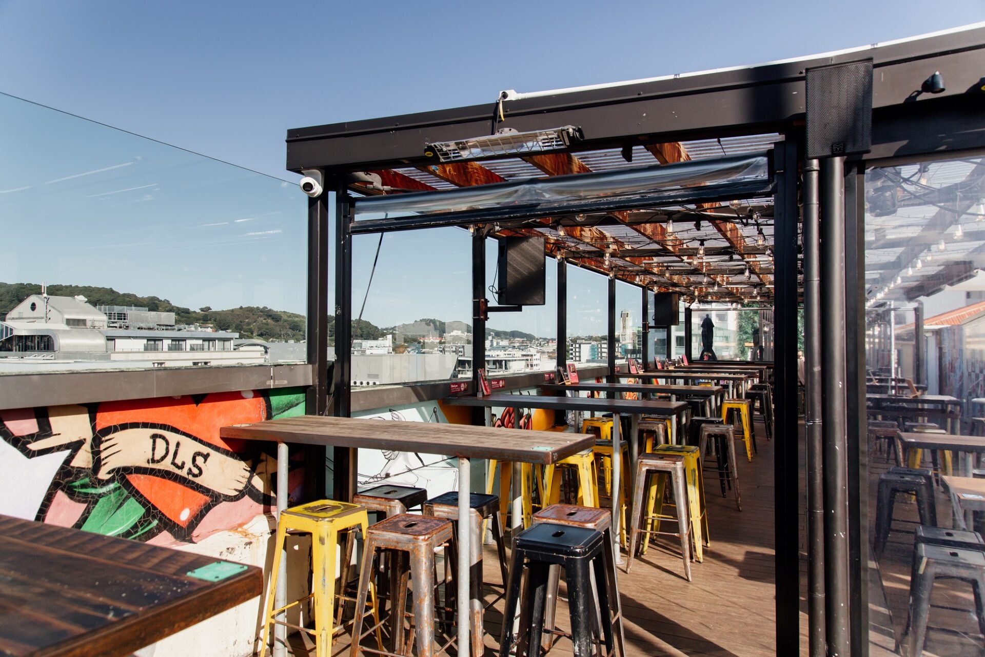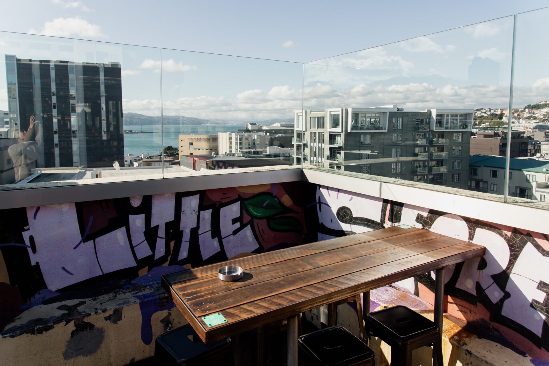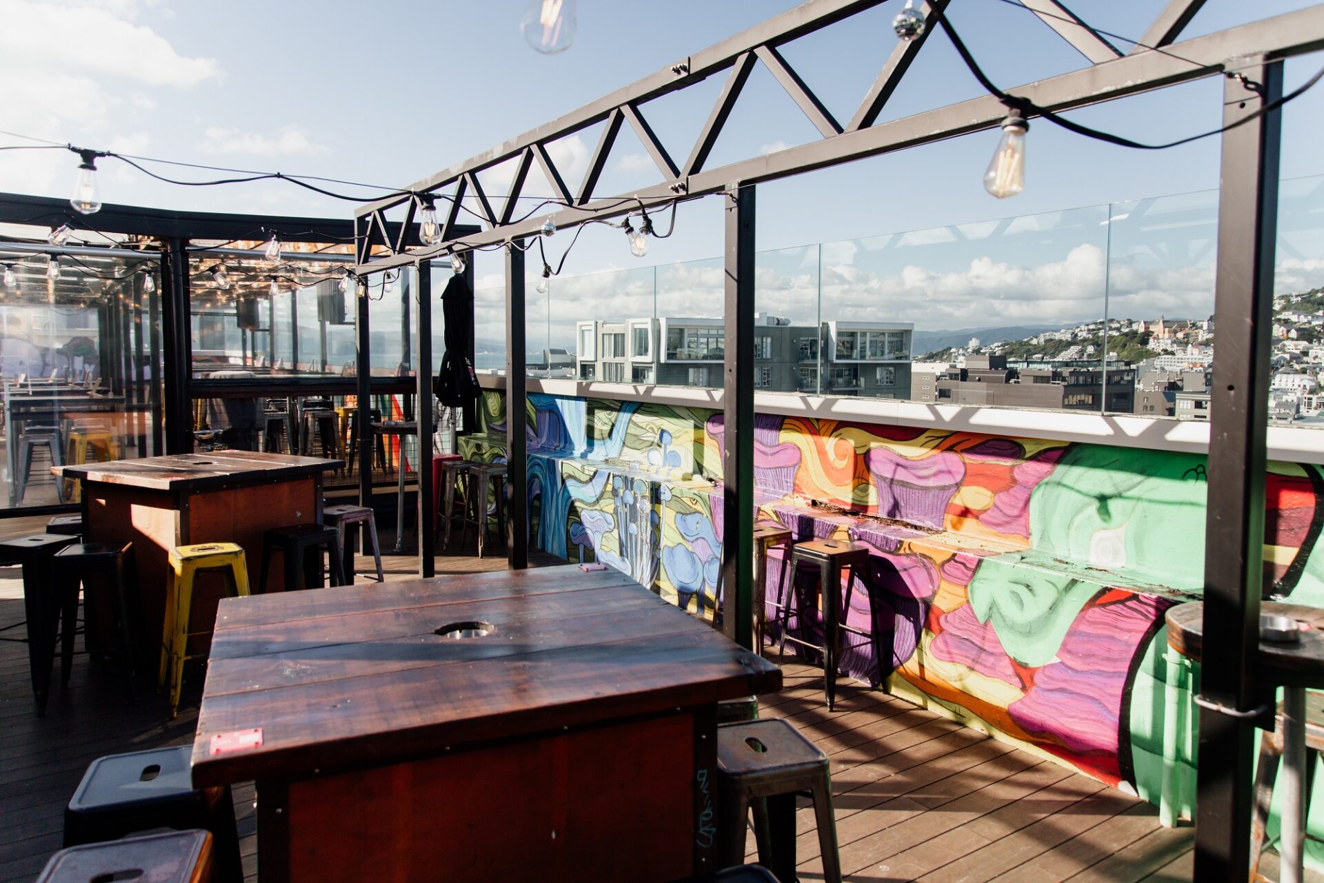 Semi-private outdoor space with views for days over the water and Courtenay Place, with Insta – worthy wall art and in close proximity to the bar.