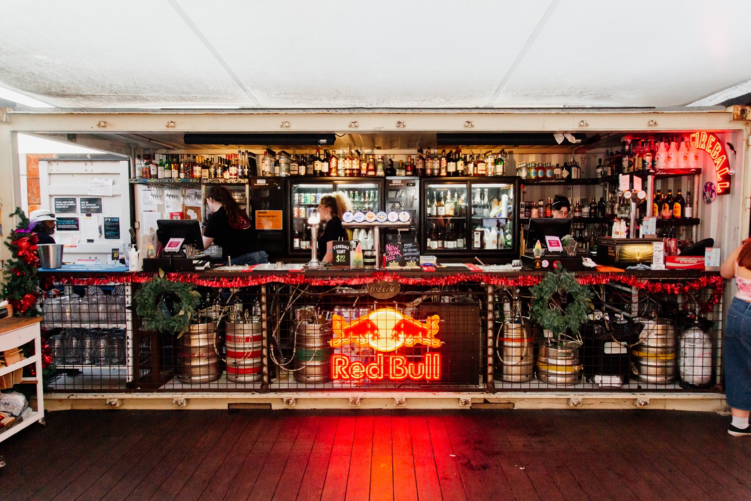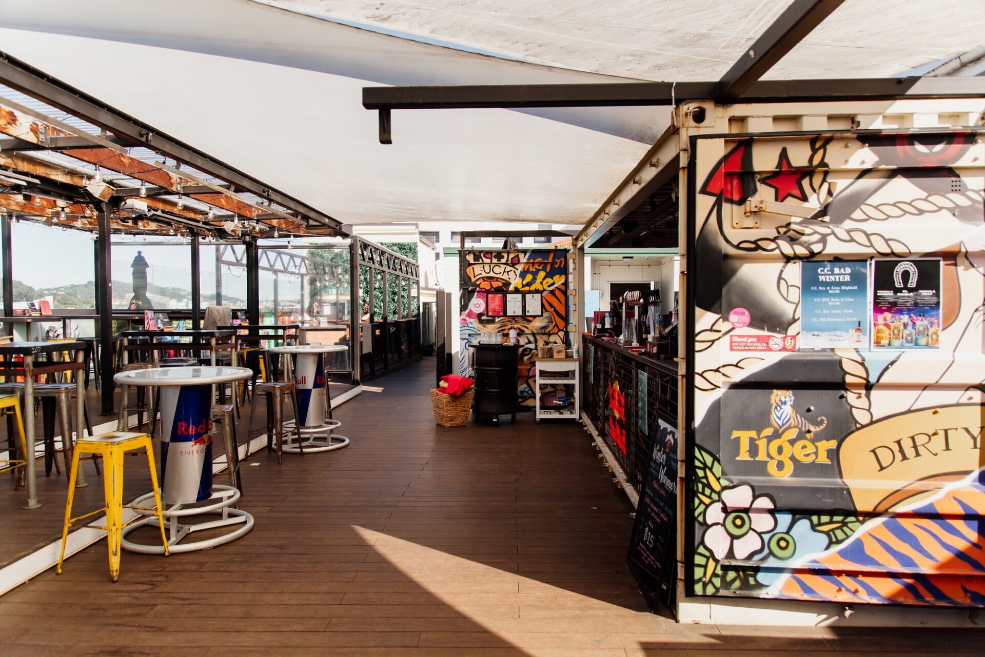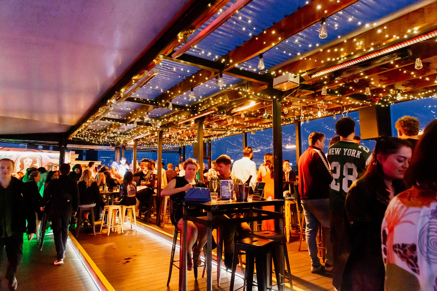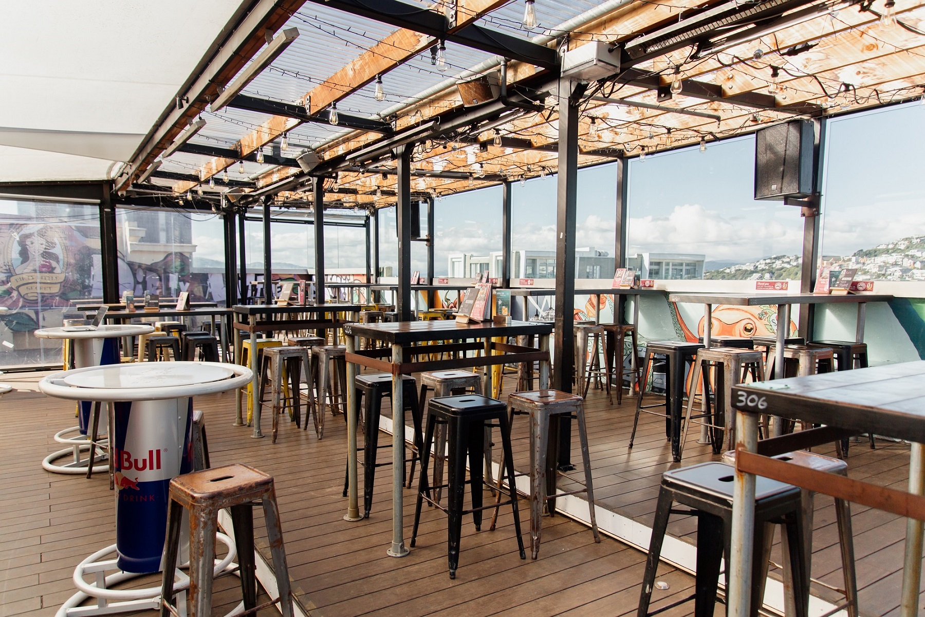 Semi-private outdoor space with views for days over the water and Courtenay Place, with Insta – worthy wall art and in close proximity to the bar.
